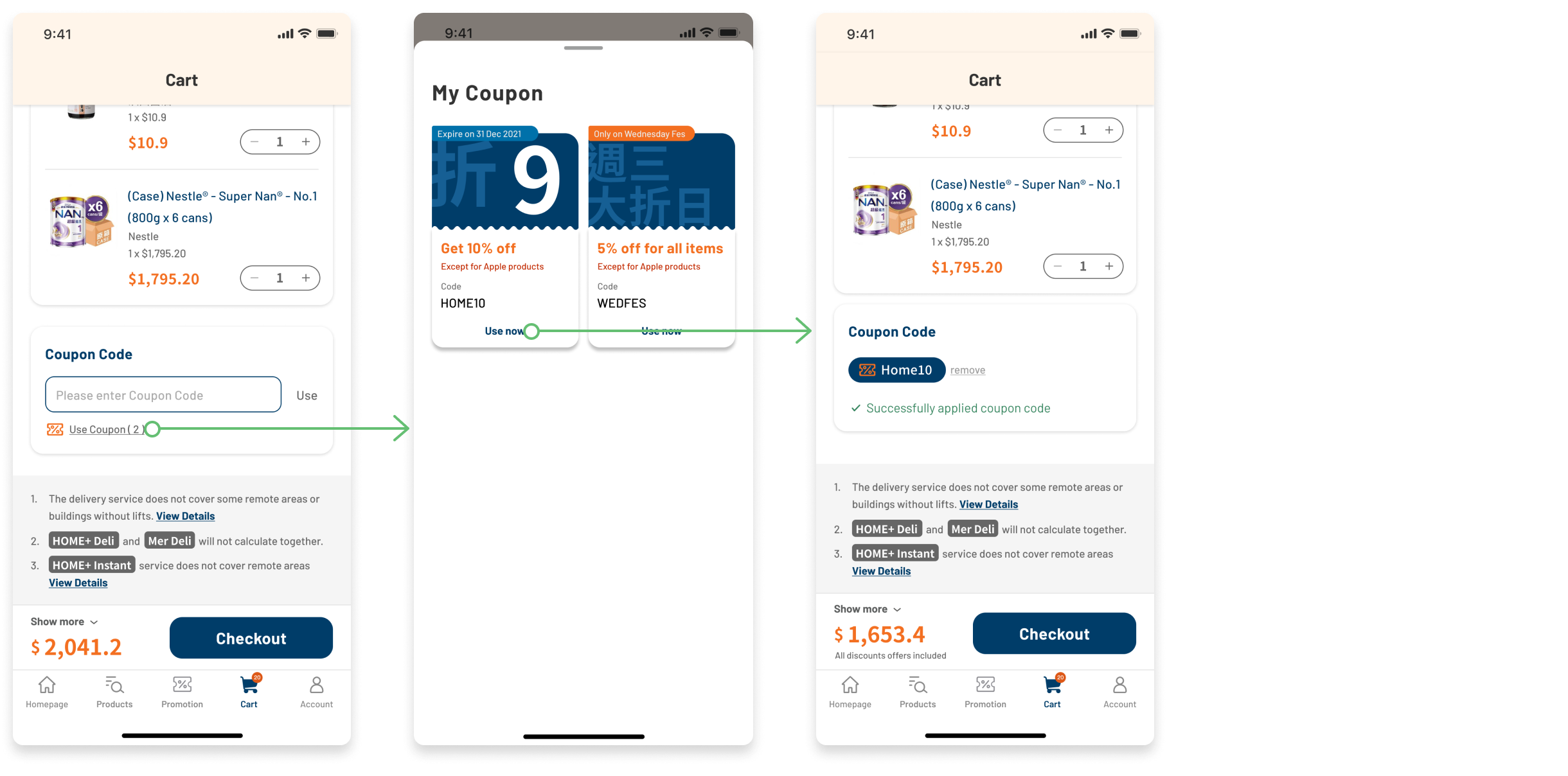 Users can apply coupon code directly in shopping cart without inputing manually